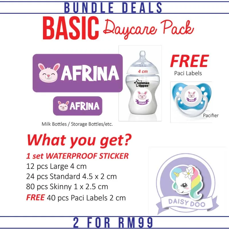 RM 69.00The Basic Daycare Pack is the perfect pack to help your little one make the transition to childcare, daycare, kindergarten or nursery. It contains a bunch of name labels that will look great on their pacifier, milk bottles, lunch box, etc. and help make sure that it all comes home again after their big first day.