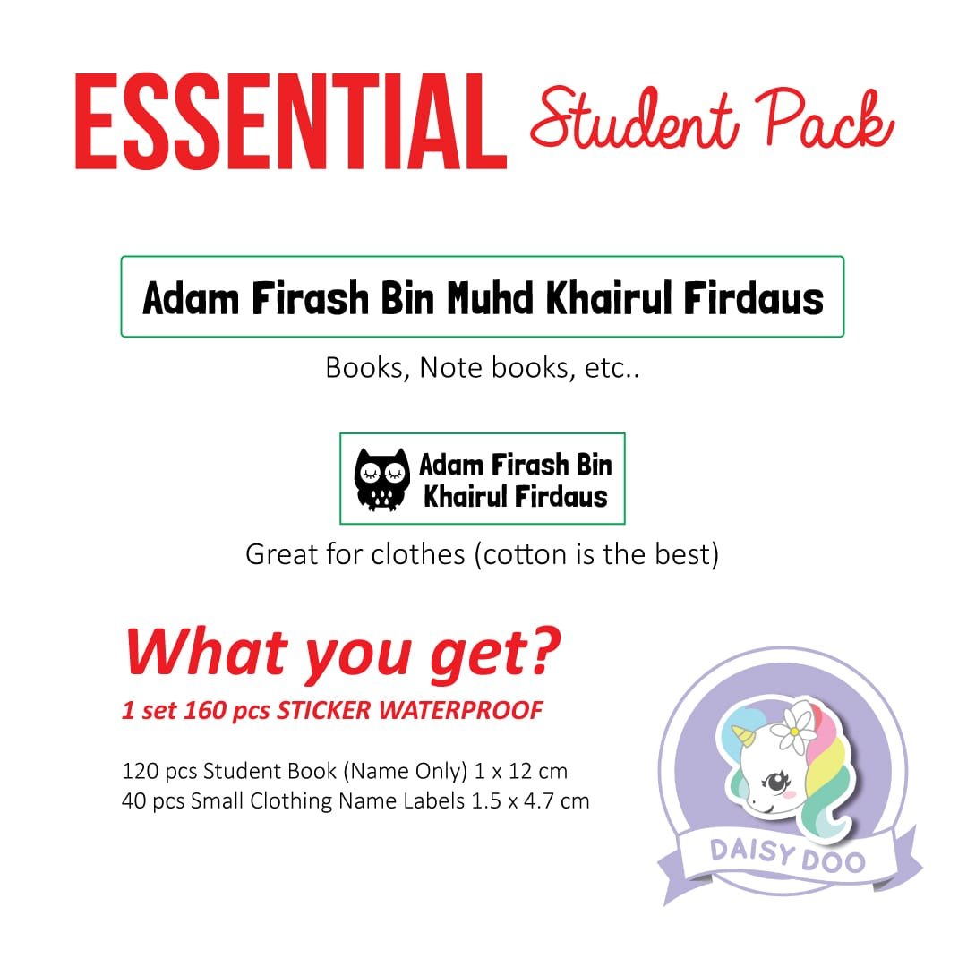 RM 59.00The Student Pack is the perfect pack to help your little one make the transition to primary and secondary school. It contains a bunch of name labels that will look great on their books, exercise book, pencils, etc. and help make sure that it all comes home again after their big first day (and all the other school days after that too!)