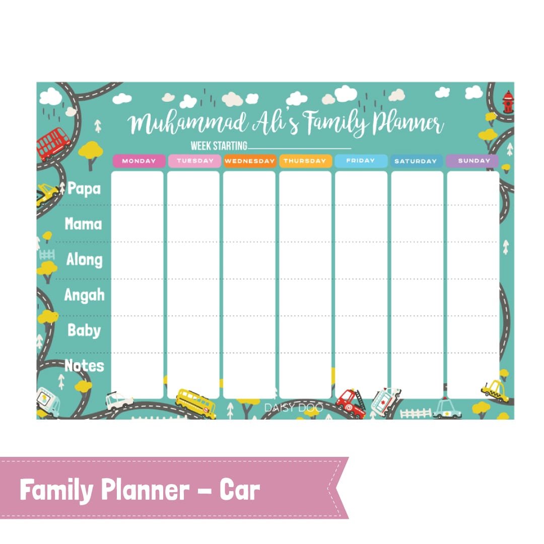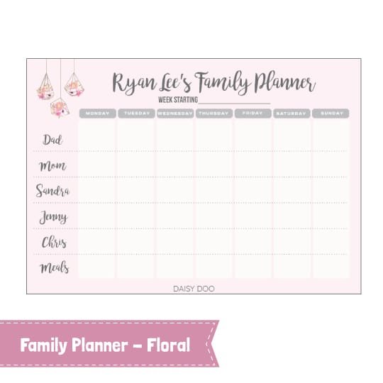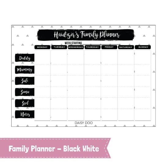For busy people on the go, a Family Planner is a must. Our collection of planners lets you write down all your appointments, events, meetings, and more in a neat and organised way. This planner allows you to add whatever text you want for the title. Personalise your Family Planner with your children’s names, making it simple to keep track of who needs to be where and when.