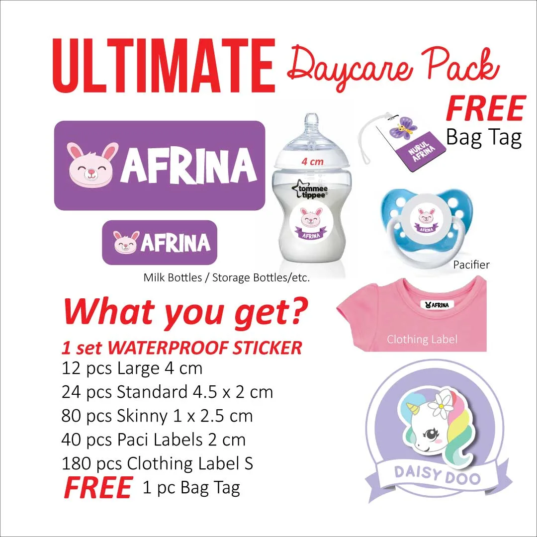 RM 250.00The Ultimate Daycare Pack is the perfect pack to help your little one make the transition to childcare, daycare, kindergarten or nursery. It contains a bunch of name labels that will look great on their uniforms, pacifier, milk bottles, lunch box, etc. and help make sure that it all comes home again after their big first day.