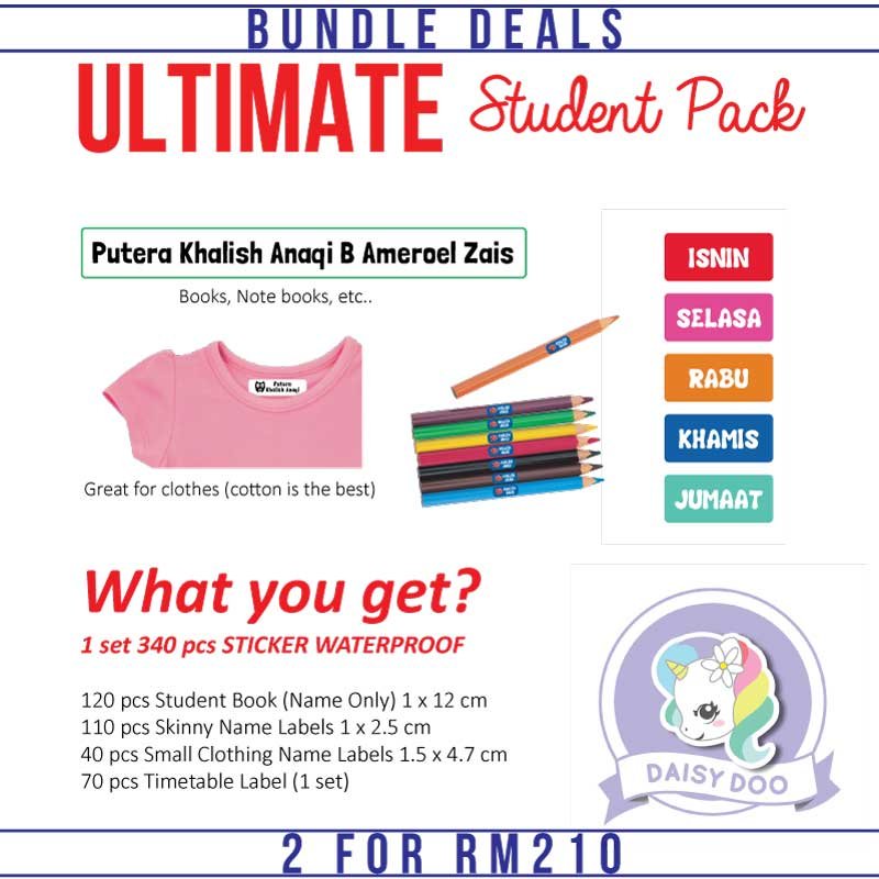 The Ultimate Student Pack is the perfect pack to help your little one make the transition to primary and secondary school. It contains a bunch of name labels that will look great on their books, exercise book, pencils, clothes, etc. and help make sure that it all comes home again after their big first day (and all the other school days after that too!)