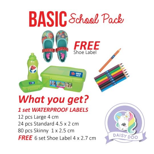 The Basic School Pack is the perfect pack to help your little one make the transition to school. It contains a bunch of name labels that will look great on their, shoes, pencils, lunch box, etc. and help make sure that it all comes home again after their big first day (and all the other school days after that too!)