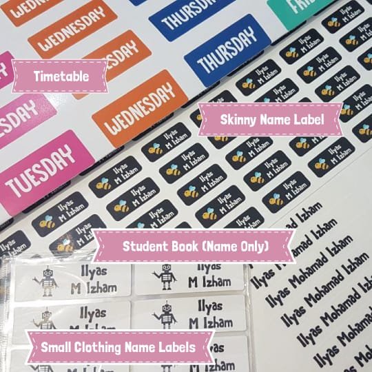 The Ultimate Student Pack is the perfect pack to help your little one make the transition to primary and secondary school. It contains a bunch of name labels that will look great on their books, exercise book, pencils, clothes, etc. and help make sure that it all comes home again after their big first day (and all the other school days after that too!)