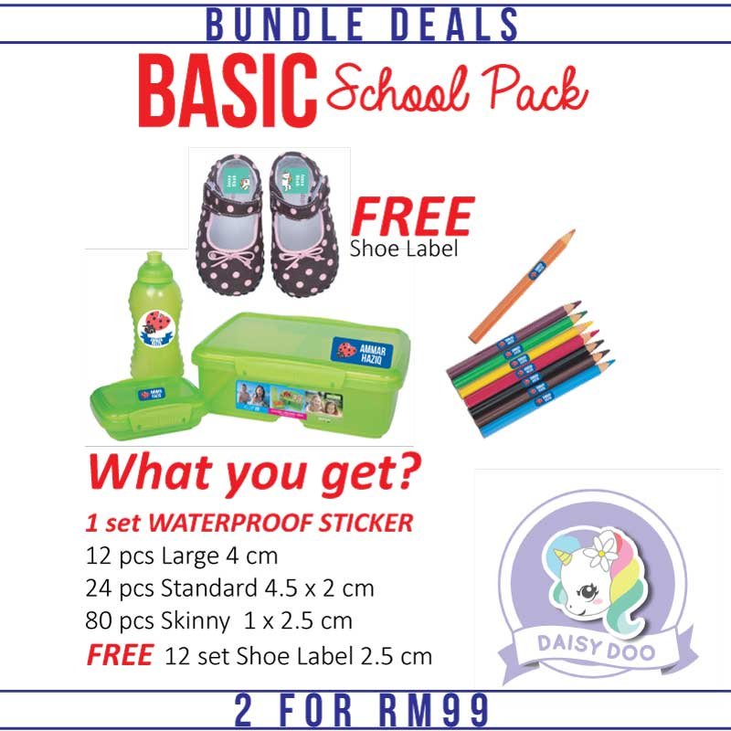 RM 69.00The Basic School Pack is the perfect pack to help your little one make the transition to school. It contains a bunch of name labels that will look great on their, shoes, pencils, lunch box, etc. and help make sure that it all comes home again after their big first day (and all the other school days after that too!)